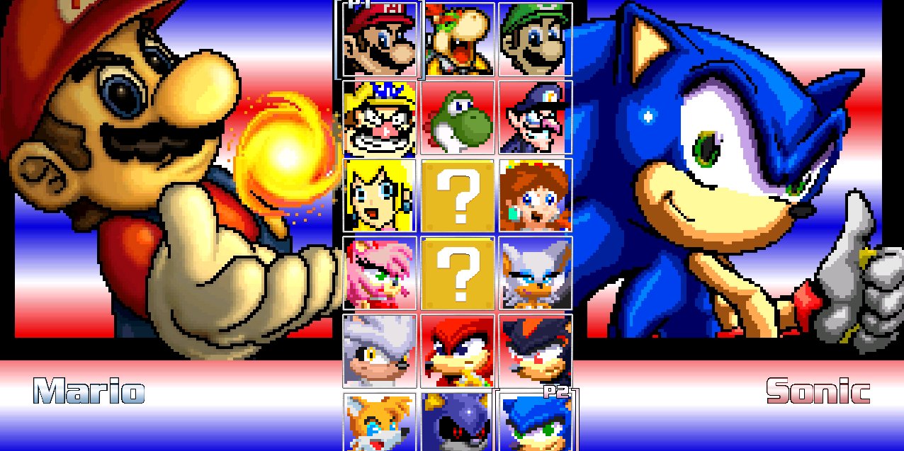 Mario vs Sonic es un fangame de lucha aun no terminado con los personajes de la obra para máximo 2 jugadores en el mismo equipo o contrario, tambien contiene un modo historias solo en la version final que aun no a salido.